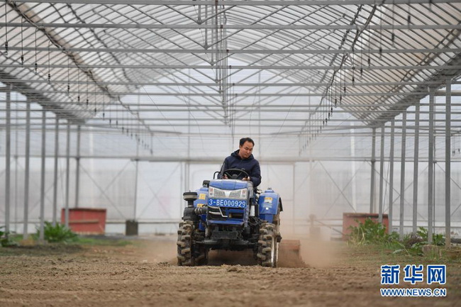 3月1日,工人在浙江省湖州市吴兴高新区灵粮农场的大棚内驾驶旋耕机进行翻耕。 新华社记者 黄宗治 摄