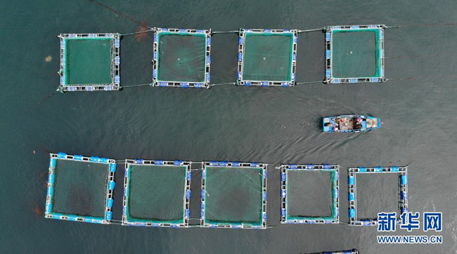 一艘渔船驶过山东省长岛综合试验区南隍城岛海上养殖区(2020年8月8日摄,无人机照片)。近年来,山东省长岛综合试验区南隍城岛在严守海洋生态红线的基础上,有序发展网箱养殖、立体生态养殖等特色海洋经济。 新华社记者 王凯 摄