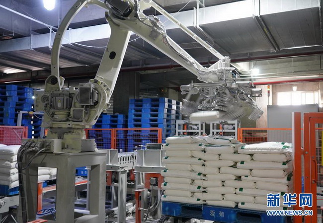在西安国际港务区爱菊农产品物流加工园区内,面粉生产线上的机械臂在码放包装好的面粉(2020年4月8日摄)。 新华社记者 邵瑞 摄