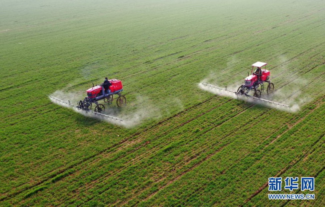 3月5日,河北省邢台市南和区阎里乡阎里村农民操作农业机械在麦田喷洒农药(无人机照片)。新华社记者 朱旭东 摄