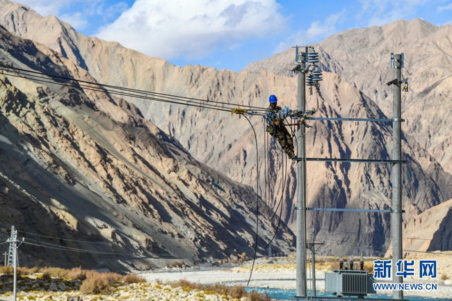 在新疆塔什库尔干塔吉克自治县的深山中,工人在调节一处入户线路的松紧度(2019年11月23日摄)。为了解决供电难题,新疆加大投入,实施光伏供电村电网延伸工程,惠及偏远村庄。 新华社记者 胡虎虎 摄