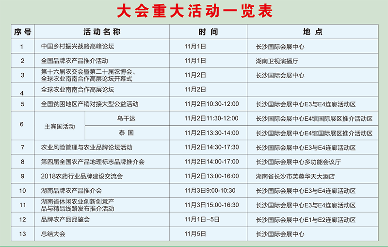 第十六届中国国际农产品交易会暨第二十届中国中部(湖南)农业博览会重大活动一览表