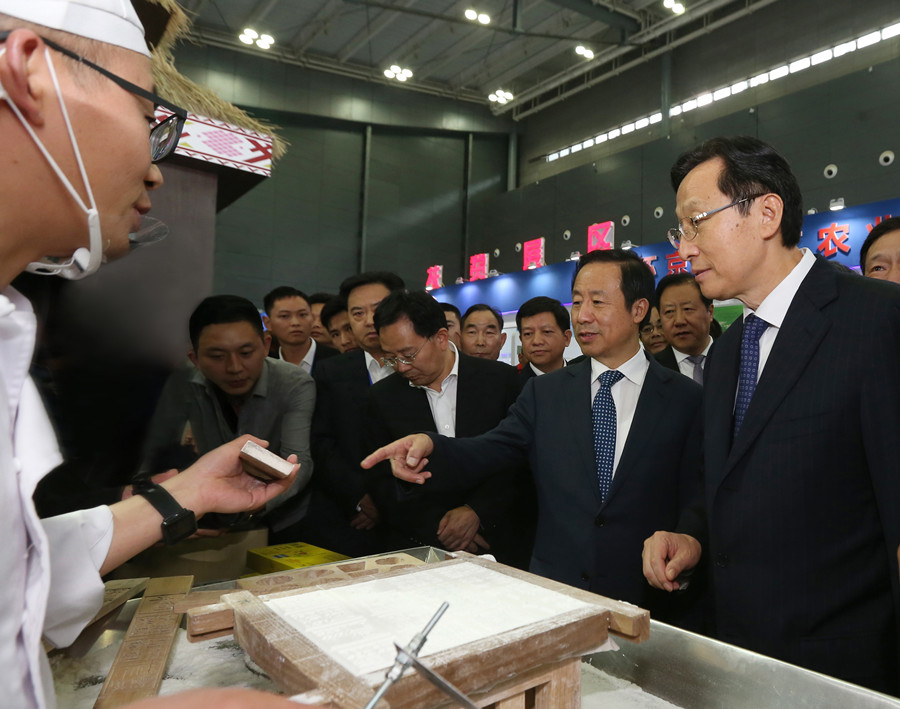 长沙国际会展中心内,11.3万平方米的布展空间内汇聚了4000多家参展企事业单位和16000余种参展产品。步入精心布置的主展馆,韩长赋、许达哲一行先后巡视了扶贫展区、乡村振兴展区、各省综合展区、湖南市州展区、海峡两岸农业合作展区、国际展区的多个展位。在扶贫展区,花垣县十八洞村展出了村里的特色农产品,介绍了农业扶贫的举措和成效,引得韩长赋、许达哲驻足良久。