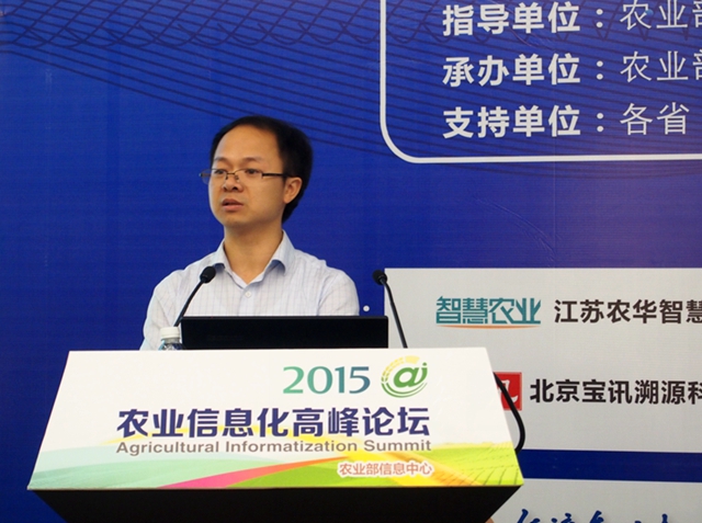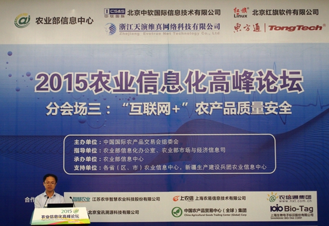 11月8日,2015农业信息化高峰论坛之“互联网+”农产品质量安全分论坛上,浙江托普云农科技股份有限公司副总经理朱旭华做关于物联网技术在农产品安全溯源中的应用的演讲。