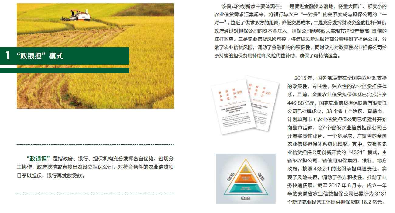“政银担”是指政府、银行、担保机构充分发挥各自优势,密切分工协作,政府扶持或直接出资设立担保公司,对符合条件的农业信贷项目予以担保,银行再发放贷款。该模式的创新点主要体现在:一是促进金融资本落地。将量大面广、额度小的农业信贷需求汇集起来,将银行与农户“一对多”的关系变成与担保公司的“一对一”,拉近了供求双方的距离,降低交易成本。二是充分发挥财政资金的杠杆作用。政府通过对担保公司的资本金注入,担保公司能够放大实现其净资产最高15倍的杠杆效应。三是农业信贷风险可控。将信贷风险从银行部分转移到了担保公司,分散了农业信贷风险,调动了金融机构的积极性。同时政府对政策性农业担保公司给“政银担”模式予...