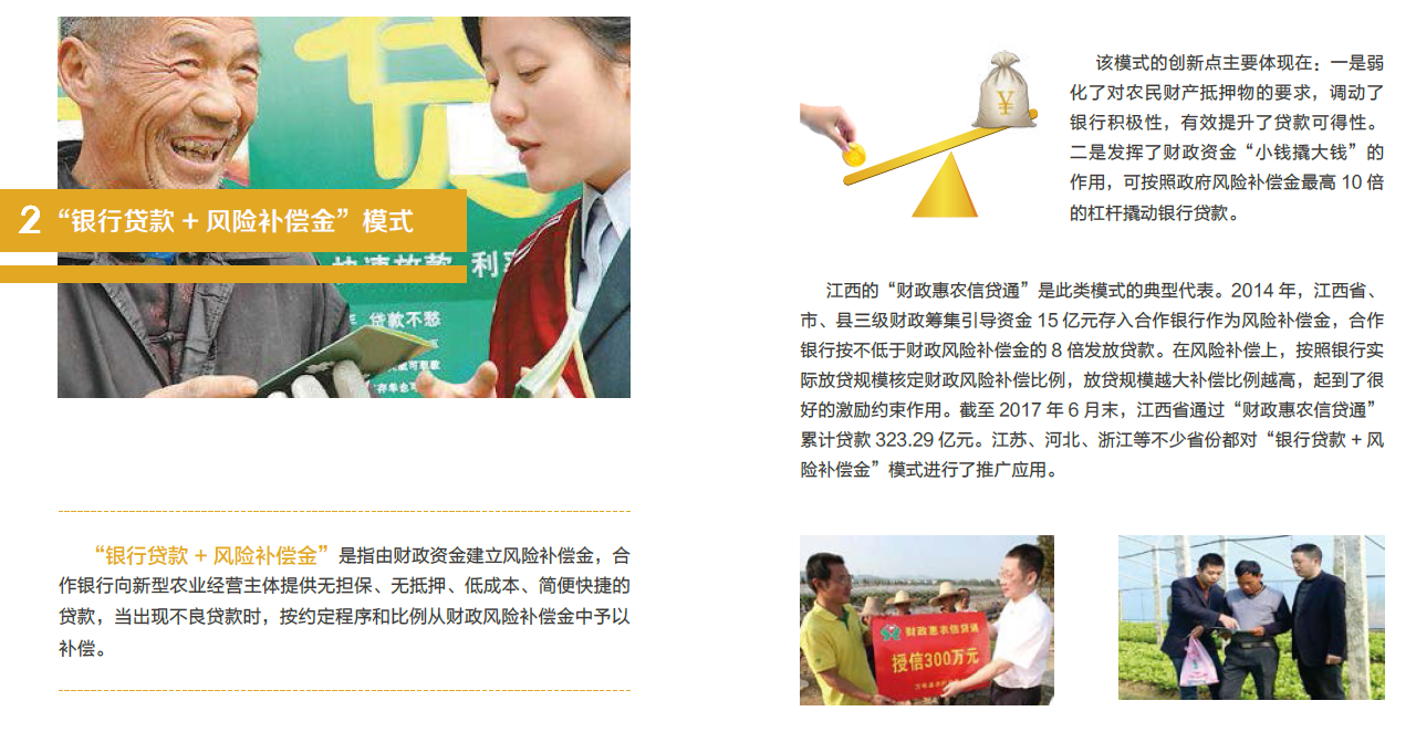 “银行贷款+风险补偿金”是指由财政资金建立风险补偿金,合作银行向新型农业经营主体提供无担保、无抵押、低成本、简便快捷的贷款,当出现不良贷款时,按约定程序和比例从财政风险补偿金中予以补偿。该模式的创新点主要体现在:一是弱化了对农民财产抵押物的要求,调动了银行积极性,有效提升了贷款可得性。二是发挥了财政资金“小钱撬大钱”的作用,可按照政府风险补偿金最高10倍的杠杆撬动银行贷款。江西的“财政惠农信贷通”是此类模式的典型代表。2014年,江西省、市、县三级财政筹集引导资金15亿元存入合作银行作为风险补偿金,合作银行按不低于财政风险补偿金的8倍发放贷款。在风险补偿上,按照银行实际放贷规模核定财政风险补偿比...