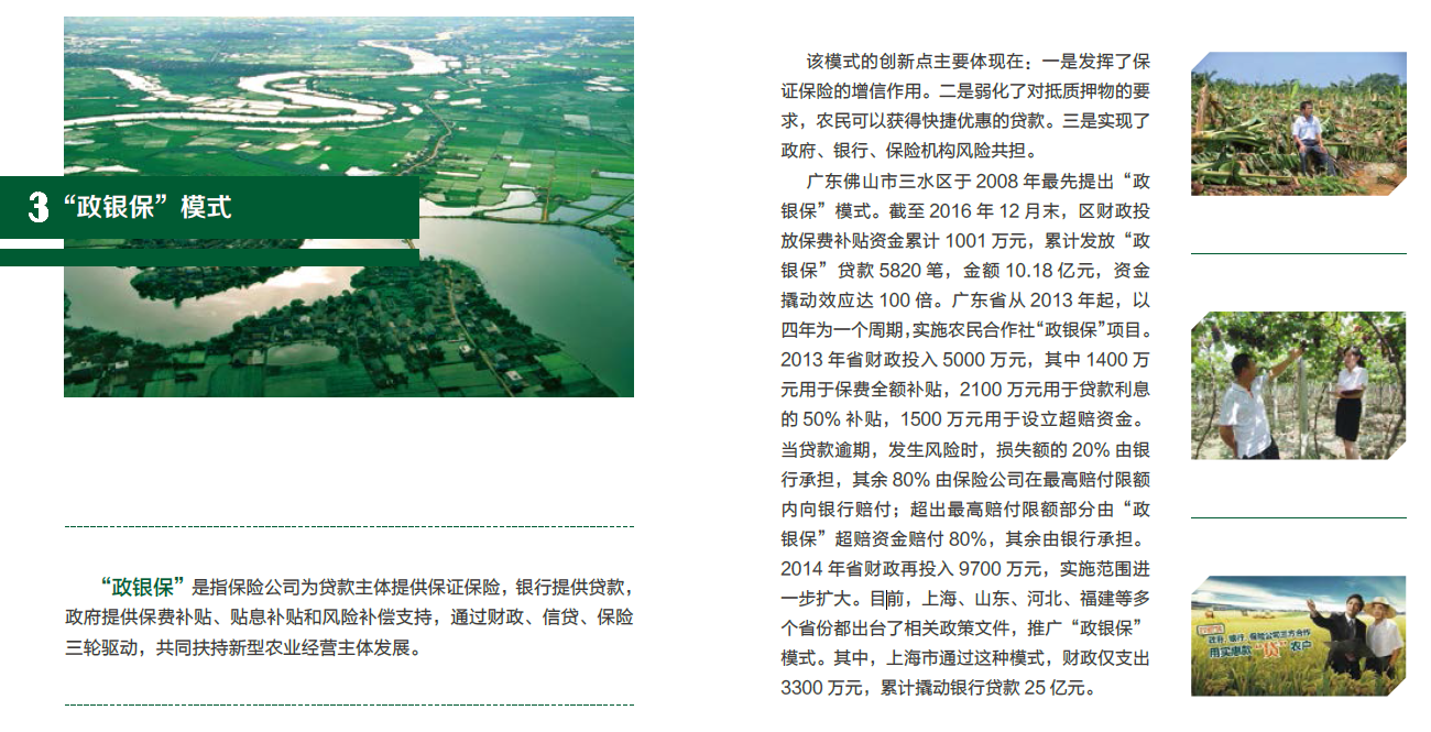 “政银保”是指保险公司为贷款主体提供保证保险,银行提供贷款,政府提供保费补贴、贴息补贴和风险补偿支持,通过财政、信贷、保险三轮驱动,共同扶持新型农业经营主体发展。该模式的创新点主要体现在:一是发挥了保证保险的增信作用。二是弱化了对抵质押物的要求,农民可以获得快捷优惠的贷款。三是实现了政府、银行、保险机构风险共担。广东佛山市三水区于2008年最先提出“政银保”模式。截至2016年12月末,区财政投放保费补贴资金累计1001万元,累计发放“政银保”贷款5820笔,金额10.18亿元,资金撬动效应达100倍。广东省从2013年起,以四年为一个周期,实施农民合作社“政银保”项目。2013年省财政投入5000万元,其中1400万元用于保...