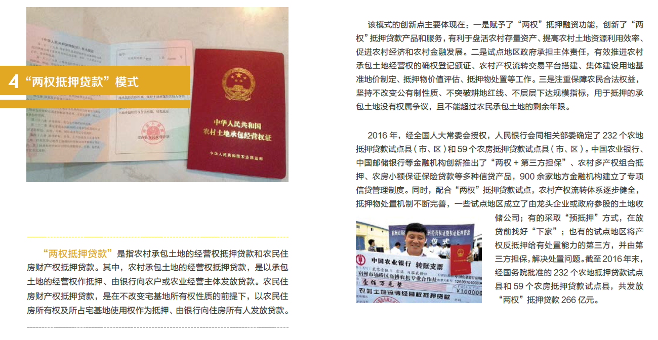 “两权抵押贷款”是指农村承包土地的经营权抵押贷款和农民住房财产权抵押贷款。其中,农村承包土地的经营权抵押贷款,是以承包土地的经营权作抵押、由银行向农户或农业经营主体发放贷款。农民住房财产权抵押贷款,是在不改变宅基地所有权性质的前提下,以农民住房所有权及所占宅基地使用权作为抵押、由银行向住房所有人发放贷款。该模式的创新点主要体现在:一是赋予了“两权”抵押融资功能,创新了“两权”抵押贷款产品和服务,有利于盘活农村存量资产、提高农村土地资源利用效率、促进农村经济和农村金融发展。二是试点地区政府承担主体责任,有效推进农村承包土地经营权的确权登记颁证、农村产权流转交易平台搭建、集体建设用地基准地...