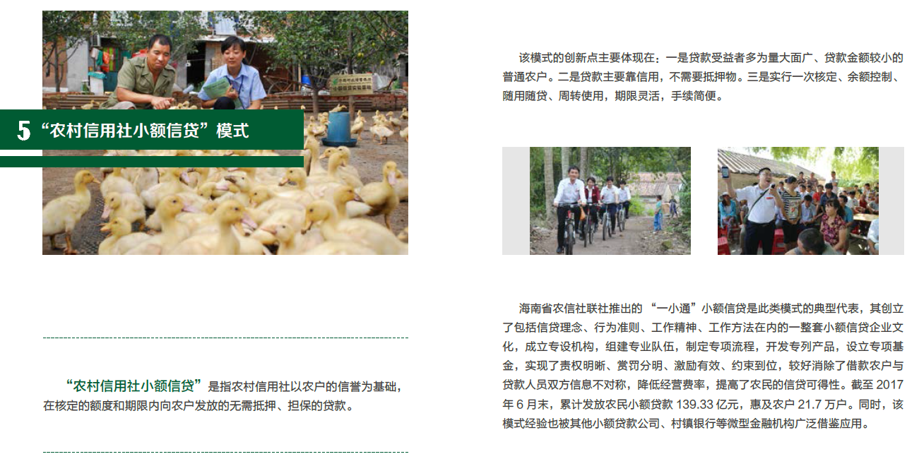 “农村信用社小额信贷”是指农村信用社以农户的信誉为基础,在核定的额度和期限内向农户发放的无需抵押、担保的贷款。该模式的创新点主要体现在:一是贷款受益者多为量大面广、贷款金额较小的普通农户。二是贷款主要靠信用,不需要抵押物。三是实行一次核定、余额控制、随用随贷、周转使用,期限灵活,手续简便。海南省农信社联社推出的“一小通”小额信贷是此类模式的典型代表,其创立了包括信贷理念、行为准则、工作精神、工作方法在内的一整套小额信贷企业文化,成立专设机构,组建专业队伍,制定专项流程,开发专列产品,设立专项基金,实现了责权明晰、赏罚分明、激励有效、约束到位,较好消除了借款农户与贷款人员双方信息不对称,...