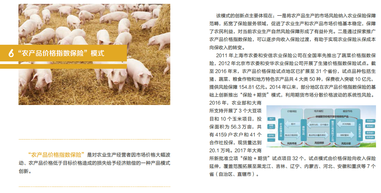 “农产品价格指数保险”是对农业生产经营者因市场价格大幅波动、农产品价格低于目标价格造成的损失给予经济赔偿的一种产品模式创新。该模式的创新点主要体现在:一是将农产品生产的市场风险纳入农业保险保障范畴,拓宽了保险服务领域,促进了农业生产和农产品市场价格基本稳定,保障了农民利益,对当前农业生产自然风险保障形成了有益补充。二是通过探索推广农产品价格指数保险,可以逐步向收入保险过渡,有助于实现农业保险从保成本向保收入的转变。2011年上海市农委和安信农业保险公司在全国率先推出了蔬菜价格指数保险,2012年北京市农委和安华农业保险公司开展了生猪价格指数保险试点。截至2016年末,农产品价格保险试点地区已扩展至3...