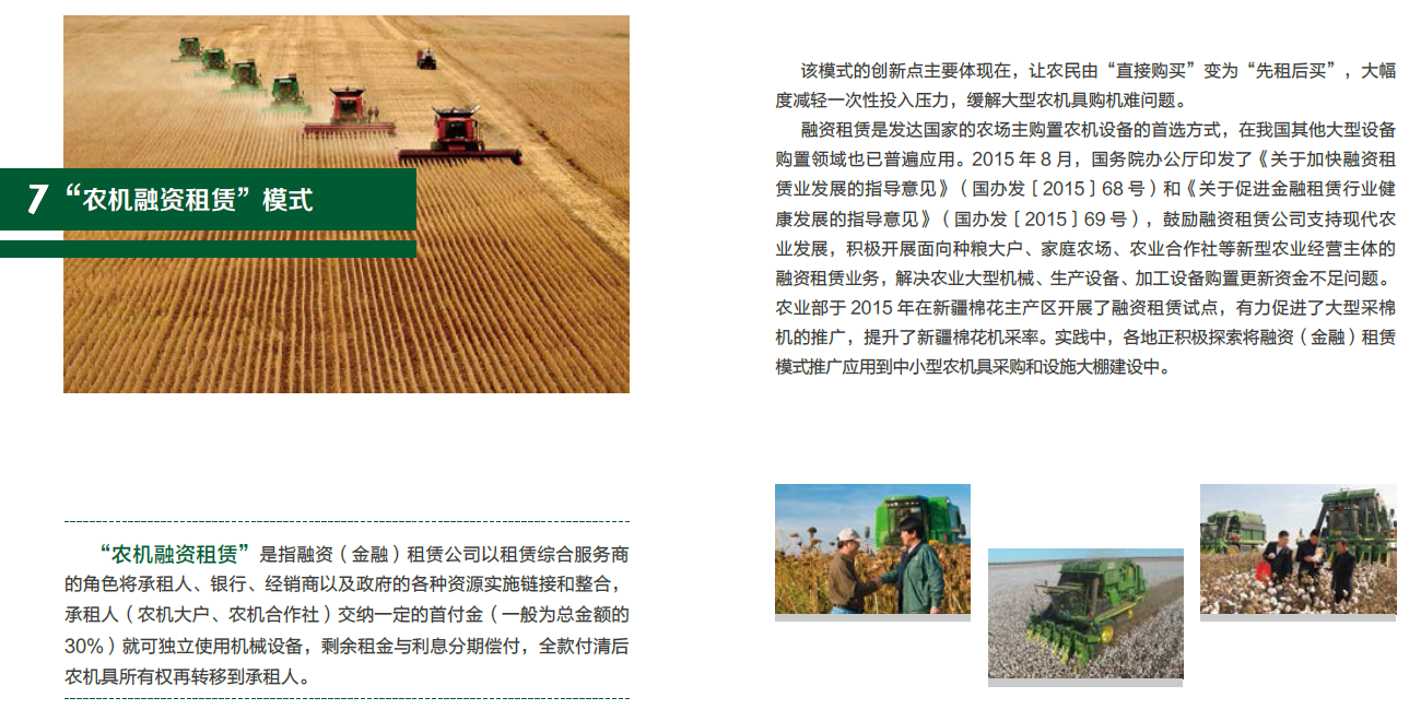 “农机融资租赁”是指融资(金融)租赁公司以租赁综合服务商的角色将承租人、银行、经销商以及政府的各种资源实施链接和整合,承租人(农机大户、农机合作社)交纳一定的首付金(一般为总金额的30%)就可独立使用机械设备,剩余租金与利息分期偿付,全款付清后农机具所有权再转移到承租人。该模式的创新点主要体现在,让农民由“直接购买”变为“先租后买”,大幅度减轻一次性投入压力,缓解大型农机具购机难问题。融资租赁是发达国家的农场主购置农机设备的首选方式,在我国其他大型设备购置领域也已普遍应用。农业部于2015年在新疆棉花主产区开展了融资租赁试点,有力促进了大型采棉机的推广,提升了新疆棉花机采率。实践中,各地正积极...