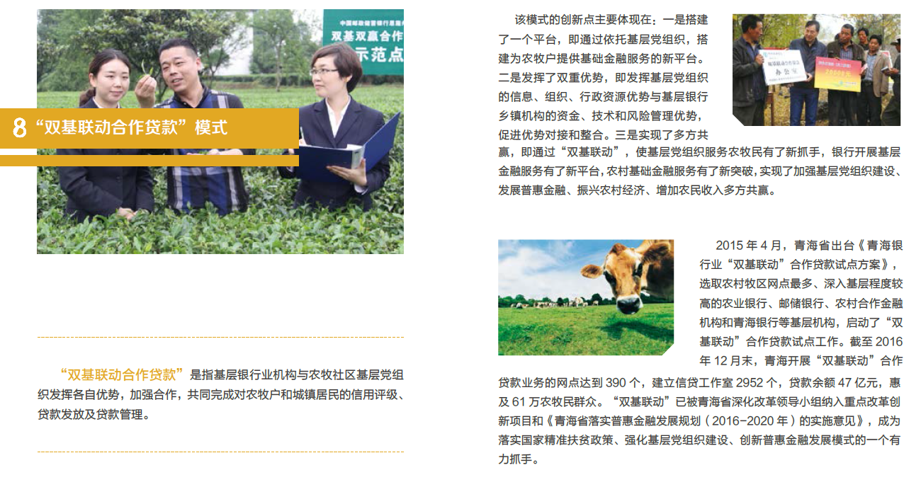 “双基联动合作贷款”是指基层银行业机构与农牧社区基层党组织发挥各自优势,加强合作,共同完成对农牧户和城镇居民的信用评级、贷款发放及贷款管理。该模式的创新点主要体现在:一是搭建了一个平台,即通过依托基层党组织,搭建为农牧户提供基础金融服务的新平台。二是发挥了双重优势,即发挥基层党组织的信息、组织、行政资源优势与基层银行乡镇机构的资金、技术和风险管理优势,促进优势对接和整合。三是实现了多方共赢,即通过“双基联动”,使基层党组织服务农牧民有了新抓手,银行开展基层金融服务有了新平台,农村基础金融服务有了新突破,实现了加强基层党组织建设、发展普惠金融、振兴农村经济、增加农民收入多方共赢。