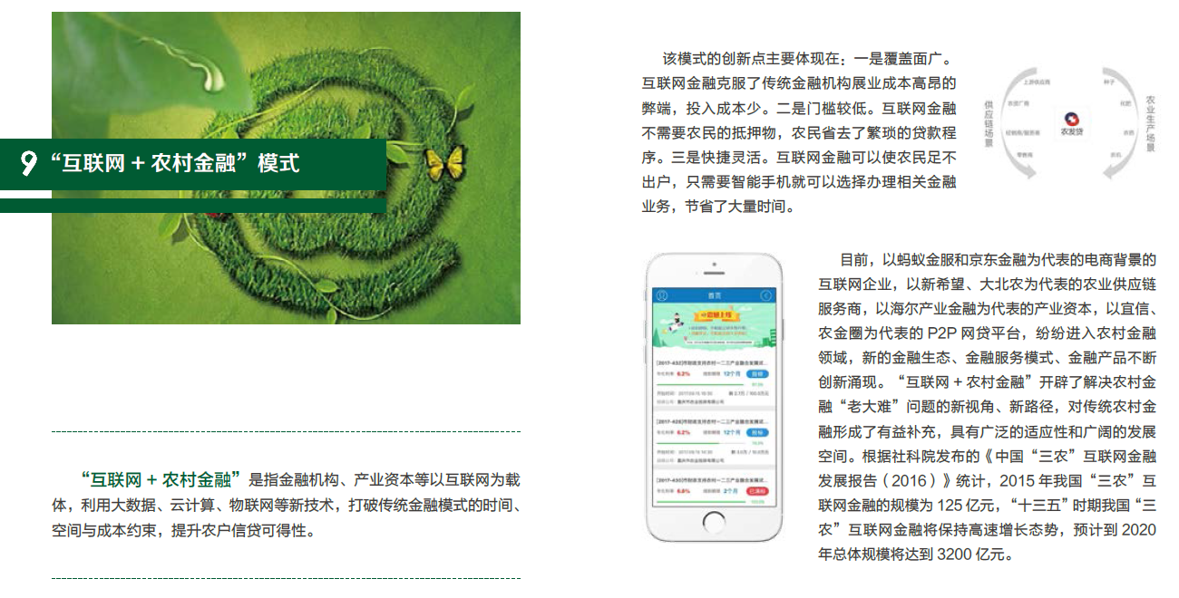 “互联网+农村金融”是指金融机构、产业资本等以互联网为载体,利用大数据、云计算、物联网等新技术,打破传统金融模式的时间、空间与成本约束,提升农户信贷可得性。该模式的创新点主要体现在:一是覆盖面广。互联网金融克服了传统金融机构展业成本高昂的弊端,投入成本少。二是门槛较低。互联网金融不需要农民的抵押物,农民省去了繁琐的贷款程序。三是快捷灵活。互联网金融可以使农民足不出户,只需要智能手机就可以选择办理相关金融业务,节省了大量时间。目前,以蚂蚁金服和京东金融为代表的电商背景的互联网企业,以新希望、大北农为代表的农业供应链服务商,以海尔产业金融为代表的产业资本,以宜信、农金圈为代表的P2P网贷平台,...