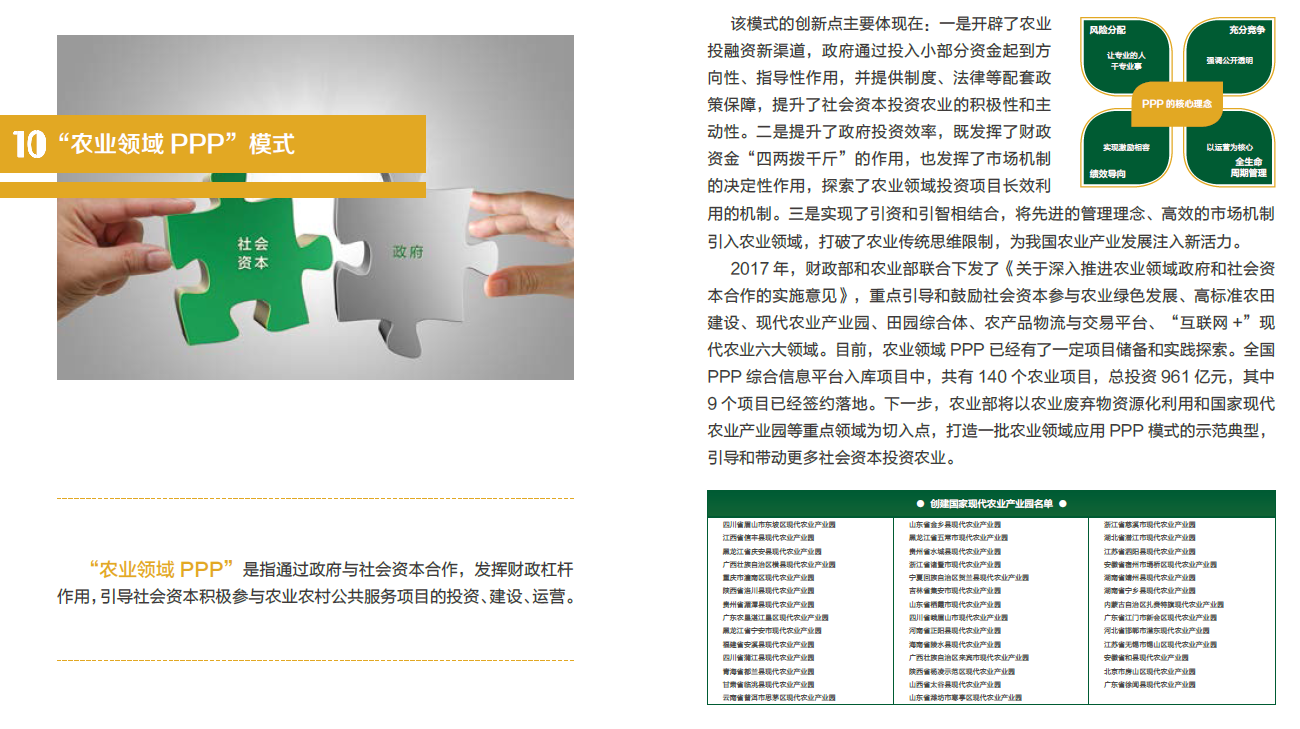 “农业领域PPP”是指通过政府与社会资本合作,发挥财政杠杆作用,引导社会资本积极参与农业农村公共服务项目的投资、建设、运营。该模式的创新点主要体现在:一是开辟了农业投融资新渠道,政府通过投入小部分资金起到方向性、指导性作用,并提供制度、法律等配套政策保障,提升了社会资本投资农业的积极性和主动性。二是提升了政府投资效率,既发挥了财政资金“四两拨千斤”的作用,也发挥了市场机制的决定性作用,探索了农业领域投资项目长效利用的机制。三是实现了引资和引智相结合,将先进的管理理念、高效的市场机制引入农业领域,打破了农业传统思维限制,为我国农业产业发展注入新活力。