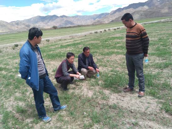6月24日,“专家西藏行”日喀则分队刘昭明、娄祥军、杨文才三位专家到日喀则开展人工草场和牲畜配种技术指导。三位专家从基地种植的牧草品种选择,绿麦草与箭筈豌豆的混播,燕麦和青贮玉米的田间管理,全株青贮技术等方面进行了讲解和指导。在日喀则种畜场,专家们从发情征状的鉴定、冻精检查、适宜配种时间、输精技巧等方面对种畜站技术人员进行了培训。