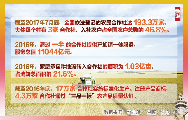 这是一份见证着我国现代农业前进步伐的成绩单:到今年7月底,全国依法登记的农民合作社达193.3万家,大体每个村有3家合作社,入社农户占全国农户总数的46.8%,合作社涵盖粮棉油、肉蛋奶等主要产品生产,并扩展到农机、植保、休闲农业等多领域。