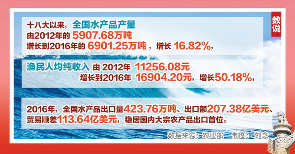 党的十八大以来,全国渔业发展延续多年来的良好发展势头,水产品产量由2012年的5907.68万吨增长到2016年的6901.25万吨,增长16.82%,水产品市场供给充足,为丰富城乡居民“菜篮子”供给发挥了重要作用。渔民人均纯收入由2012年11256.08元增长到2016年16904.20元,增长50.18%,为农业农村经济发展作出了重要贡献。2016年,全国水产品出口量423.76万吨、出口额207.38亿美元、贸易顺差113.64亿美元,稳居国内大宗农产品出口首位。