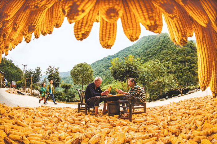 9月23日,是农历二十四节气中的秋分,祖国大地一派丰收繁忙。秋收时节,农民晾晒丰收的农作物,“晒秋”成为一道美丽的风景。图为湖北省十堰市竹山县麻家渡镇龙兴村村民在掰玉米、晒玉米。章磊摄(人民视觉)