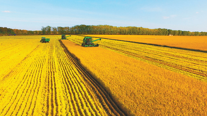 秋分将至,黑龙江垦区进入水稻收割季,垦区各农场组织大型农机开始收割水稻,确保颗粒归仓。