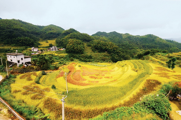日前,湖北省通城县关刀镇东山村农民种植的七彩水稻成熟,彩色水稻在梯田中形成凤凰、祥云大型图案及“凤栖东山”的字样,当地村民以此表达对党的富民政策和新农村建设的赞美,喜迎党的十九大。