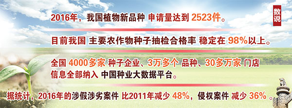 通过将传统种业与现代互联网技术牵线搭桥,目前,全国4000多家种子企业、3万多个品种、30多万家门店信息全部纳入中国种业大数据平台,凭借一枚小小的二维码,种业构建起了从制种到销售全过程的追溯系统,监管效率明显提升。据统计,2016年的涉假涉劣案件比2011年减少48%,侵权案件减少36%。