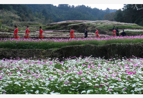 广西百色市德保县城关镇那温村村民在花海中行走(11月27日无人机拍摄)。新华社记者张善臣摄