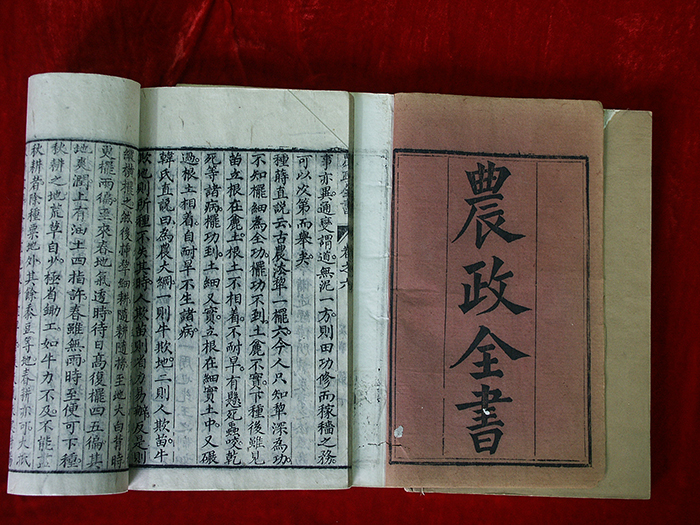 坐在桑基鱼塘背景油画前的是明末著名农学家徐光启,他所写的《农政全书》对中国传统农业生产经验进行了总结,是我国农业技术史上的一部不朽巨著,与《氾(fàn)胜之书》、《齐民要术》、《王祯农书》并称为四大农书。内容基本上囊括了古代农业生产和人民生活的各个方面,而其中又贯穿着一个基本思想,即徐光启的治国治民的“农政”思想。这是其他的大型农书所鲜见的。