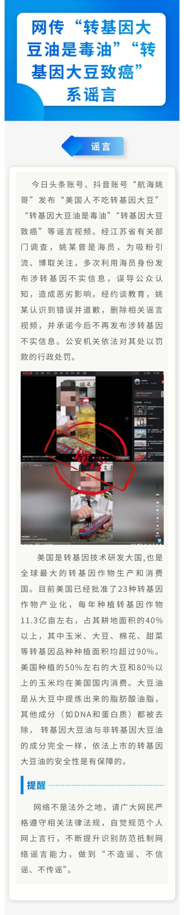 网传“转基因大豆油是毒油”“转基因大豆致癌”系谣言
