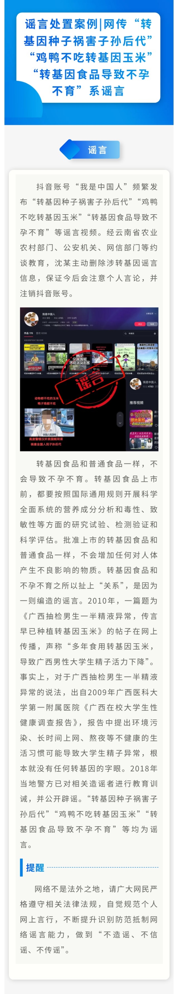 谣言处置案例|网传“转基因种子祸害子孙后代”“鸡鸭不吃转基因玉米”“转基因食品导致不孕不育”系谣言