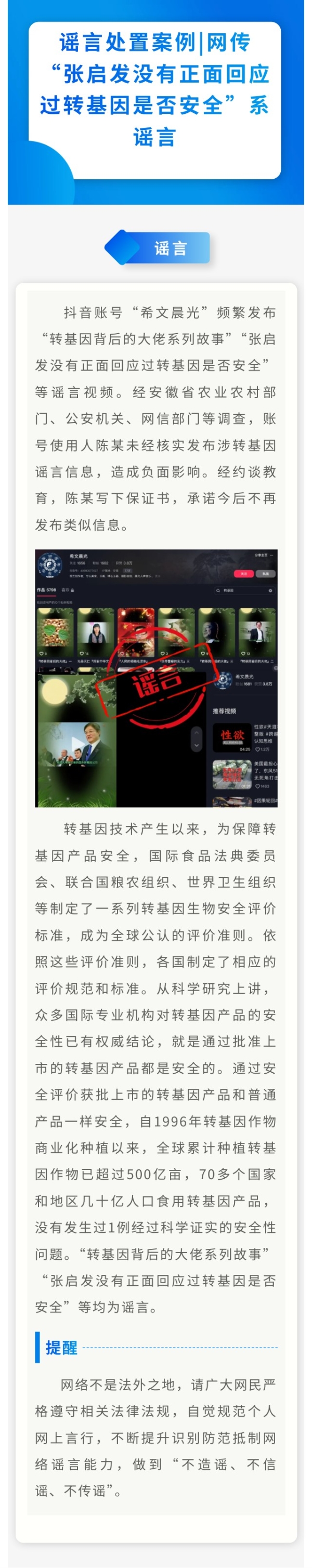 谣言处置案例|网传“张启发没有正面回应过转基因是否安全”系谣言
