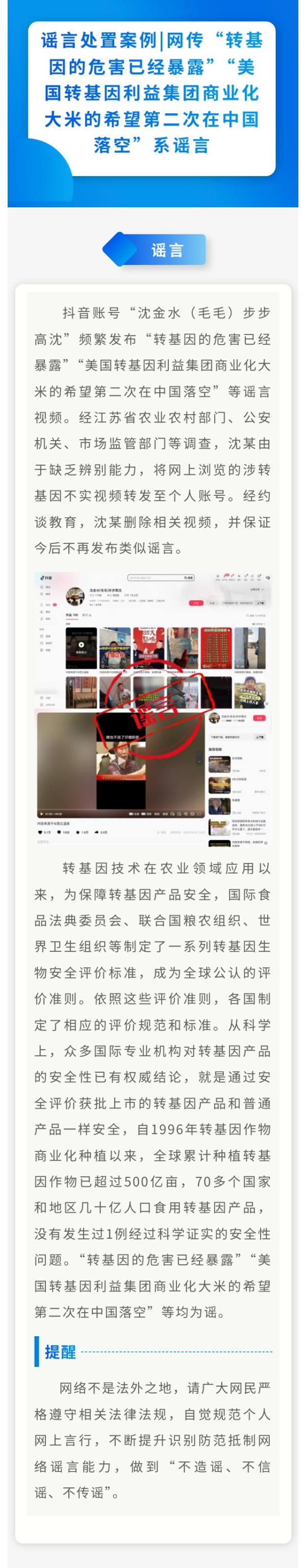 谣言处置案例丨网传“转基因的危害已经暴露”“美国转基因利益集团商业化大米的希望第二次在中国落空”系谣言