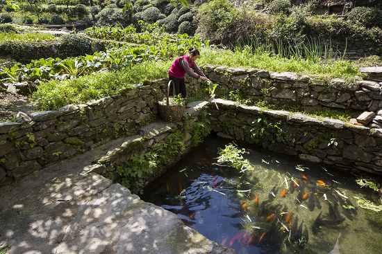 千百年来,山区居民依托优越的生态环境,在村落附近,或家前屋后,或庭院天井中,挖坑筑池,引入清澈甘洌的山泉溪水放养家鱼。鱼池都设有进水口和出水口,池内长期保持优异的水质,鱼群常年生长于山泉流水环境中,摄食当地无污染的天然饵料,是地道的有机绿色食品。山泉流水养鱼系统通过水陆相互作用,把多种生物聚集在同一单位的土地上,多层次利用物质和能量,构成了“森林-溪塘-池鱼-村落-田园”为要素的农业生态系统,营造出多样的生态基底和多元的生态空间,蕴含丰富的人文与自然景观资源,并衍生出与系统相关的乡村宗教礼仪、风俗习惯、民间文艺及饮食文化。形成了人与自然和谐共处,村落与池塘共生,水鱼与林山共育,人文与自然共荣的生态系统。