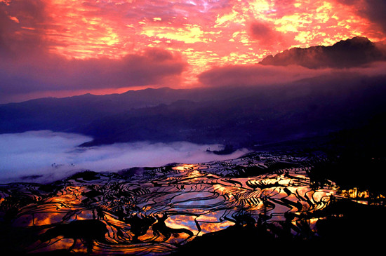 红河哈尼梯田分布于云南红河南岸的元阳、红河、金平、绿春4县的崇山峻岭中,面积约18万公顷,具有极高的经济、科学、生态和文学艺术价值。