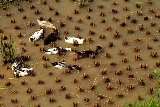 从江县位于黔东南层峦叠嶂的大山里,清澈的都柳江从北向南宛延而过。每年春天,谷雨季节的前后,侗乡人劳作的身影就出现在层层的梯田里了,秧苗插进了稻田,鱼苗也就跟着放了进去,等到鱼苗长到两三指,再把鸭苗放入稻田。稻田为鱼和鸭的生长提供了生存环境和丰富的饵料,鱼和鸭在觅食的过程中,不仅为稻田清除了虫害和杂草,大大减少了农药和除草剂的使用,而且鱼和鸭的来回游动搅动了土壤,无形中帮助稻田松了土,鱼和鸭的粪便又是水稻上好的有机肥,保养和育肥了地力。这种方式在从江已经延续了上千年,作为一种独特的农业文化遗产,它的意义,不仅仅是作为人们回望历史的窗口,也不仅仅是一块田地有了稻、鱼、鸭三种收获,更重要的是它对现代农业的宝贵启示。